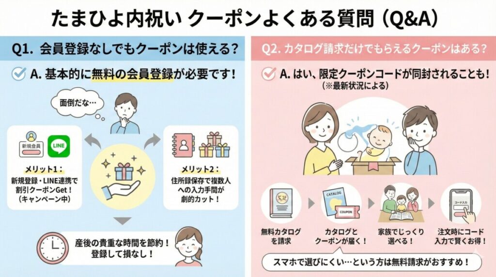 結論から言うと、たまひよ内祝いのクーポンを利用するには、基本的に無料の会員登録(たまひよ会員への登録)が必要です。